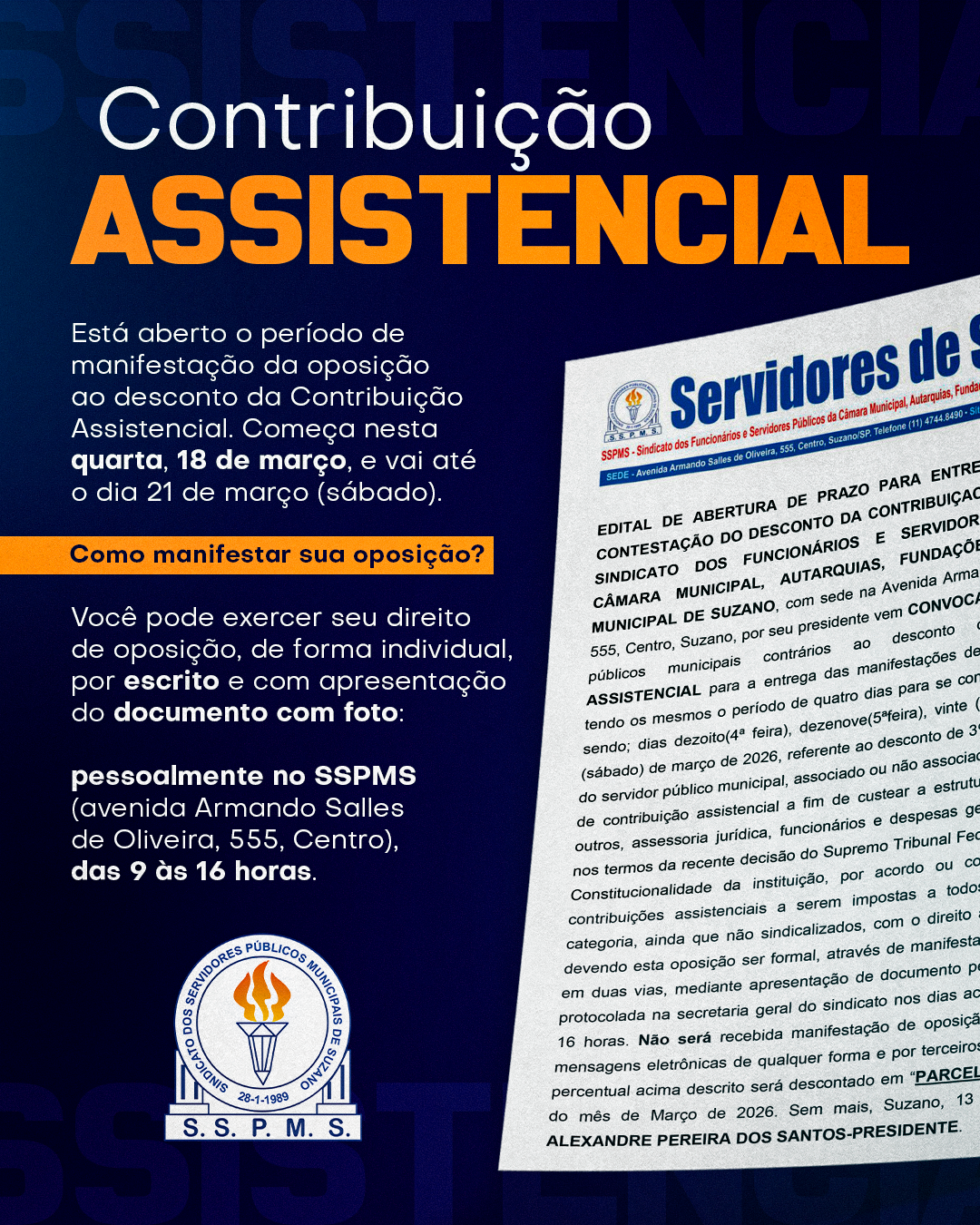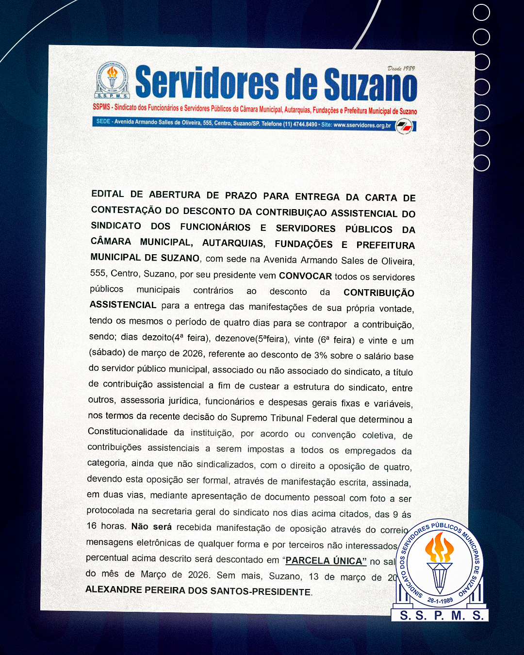 EDITAL DE ABERTURA DE PRAZO PARA ENTREGA DA CARTA DE CONTESTAÇÃO DO DESCONTO DA CONTRIBUIÇAO ASSISTENCIAL DO SINDICATO DOS FUNCIONÁRIOS E SERVIDORES PÚBLICOS DA CÂMARA MUNICIPAL, AUTARQUIAS, FUNDAÇÕES E PREFEITURA MUNICIPAL DE SUZANO, com sede na Avenida Armando Sales de Oliveira, 555, Centro, Suzano, por seu presidente vem CONVOCAR todos os servidores públicos municipais contrários ao desconto da CONTRIBUIÇÃO ASSISTENCIAL para a entrega das manifestações de sua própria vontade, tendo os mesmos o período de quatro dias para se contrapor a contribuição, sendo; dias dezoito(4ª feira), dezenove(5ªfeira), vinte (6ª feira) e vinte e um (sábado) de março de 2026, referente ao desconto de 3% sobre o salário base do servidor público municipal, associado ou não associado do sindicato, a título de contribuição assistencial a fim de custear a estrutura do sindicato, entre outros, assessoria jurídica, funcionários e despesas gerais fixas e variáveis, nos termos da recente decisão do Supremo Tribunal Federal que determinou a Constitucionalidade da instituição, por acordo ou convenção coletiva, de contribuições assistenciais a serem impostas a todos os empregados da categoria, ainda que não sindicalizados, com o direito a oposição de quatro, devendo esta oposição ser formal, através de manifestação escrita, assinada, em duas vias, mediante apresentação de documento pessoal com foto a ser protocolada na secretaria geral do sindicato nos dias acima citados, das 9 ás 16 horas. Não será recebida manifestação de oposição através do correio, mensagens eletrônicas de qualquer forma e por terceiros não interessados. O percentual acima descrito será descontado em “PARCELA ÚNICA” no salário do mês de Março de 2026. Sem mais, Suzano, 13 de março de 2026, ALEXANDRE PEREIRA DOS SANTOS-PRESIDENTE.